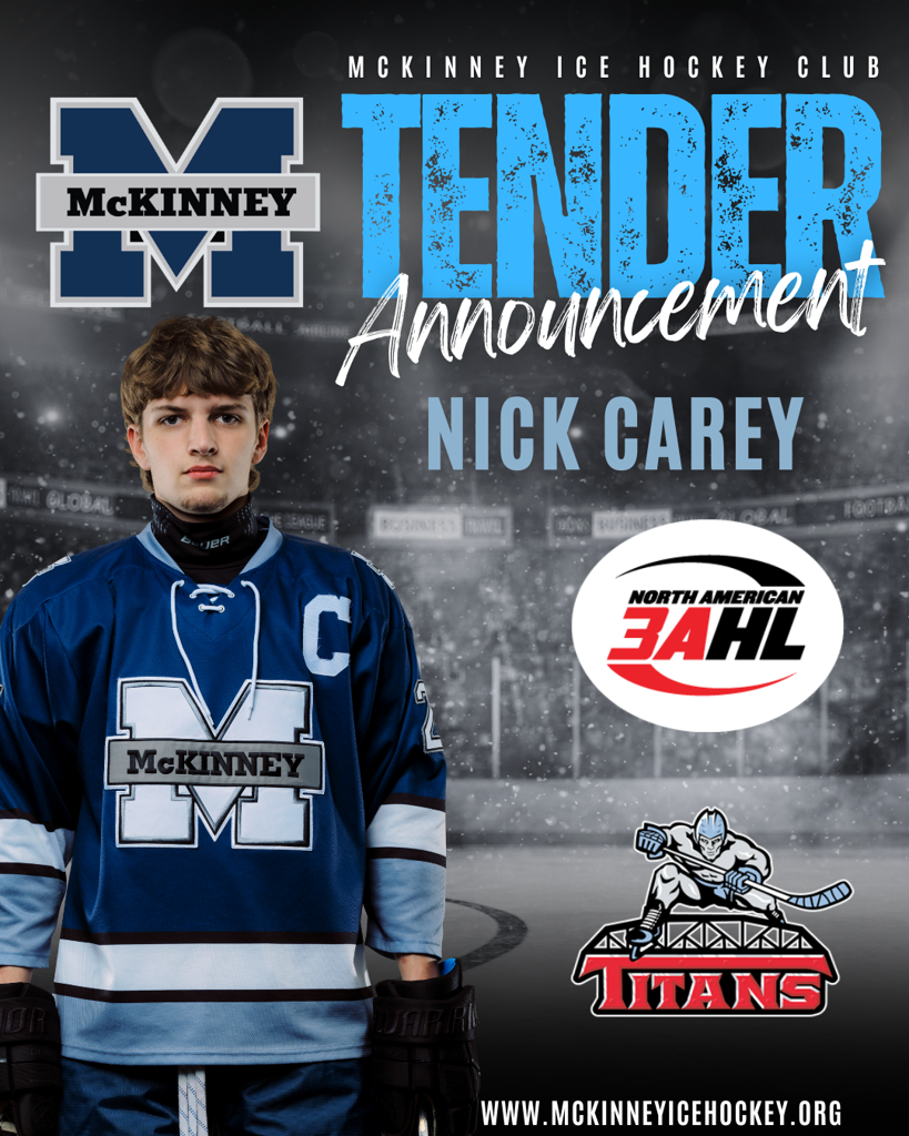 The McKinney Ice Hockey Club is proud to announce that forward and team captain Nicholas Carey has signed a tender agreement with the New Jersey Titans of the North American 3 Hockey League (NA3HL). This milestone highlights both Nick’s personal achievements and the development opportunities provided by our club for student-athletes aiming to advance to junior hockey.
