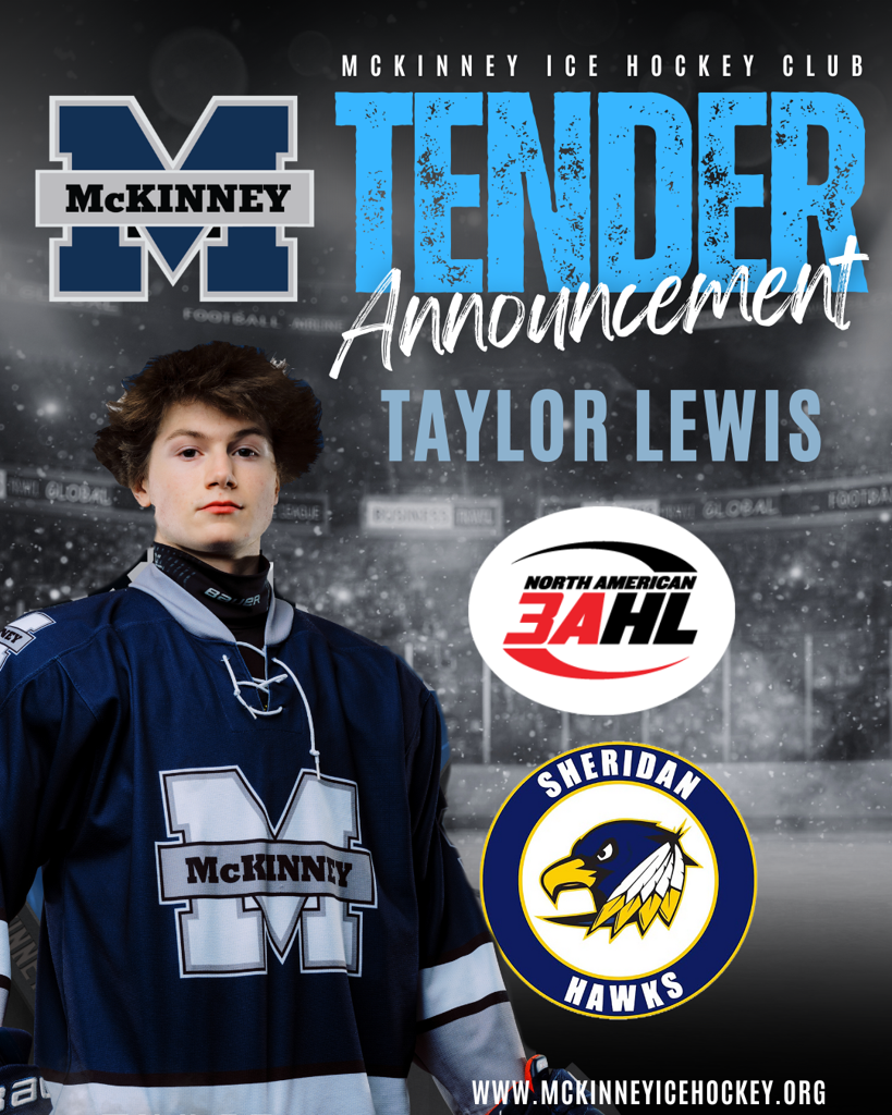 The McKinney Ice Hockey Club is proud to announce that defenseman Taylor Lewis has signed a tender agreement with the Sheridan Hawks of the North American 3 Hockey League (NA3HL) today, April 16, 2025. This signing represents a significant step in Taylor's hockey career and highlights the development pathway our program strives to create for student-athletes.