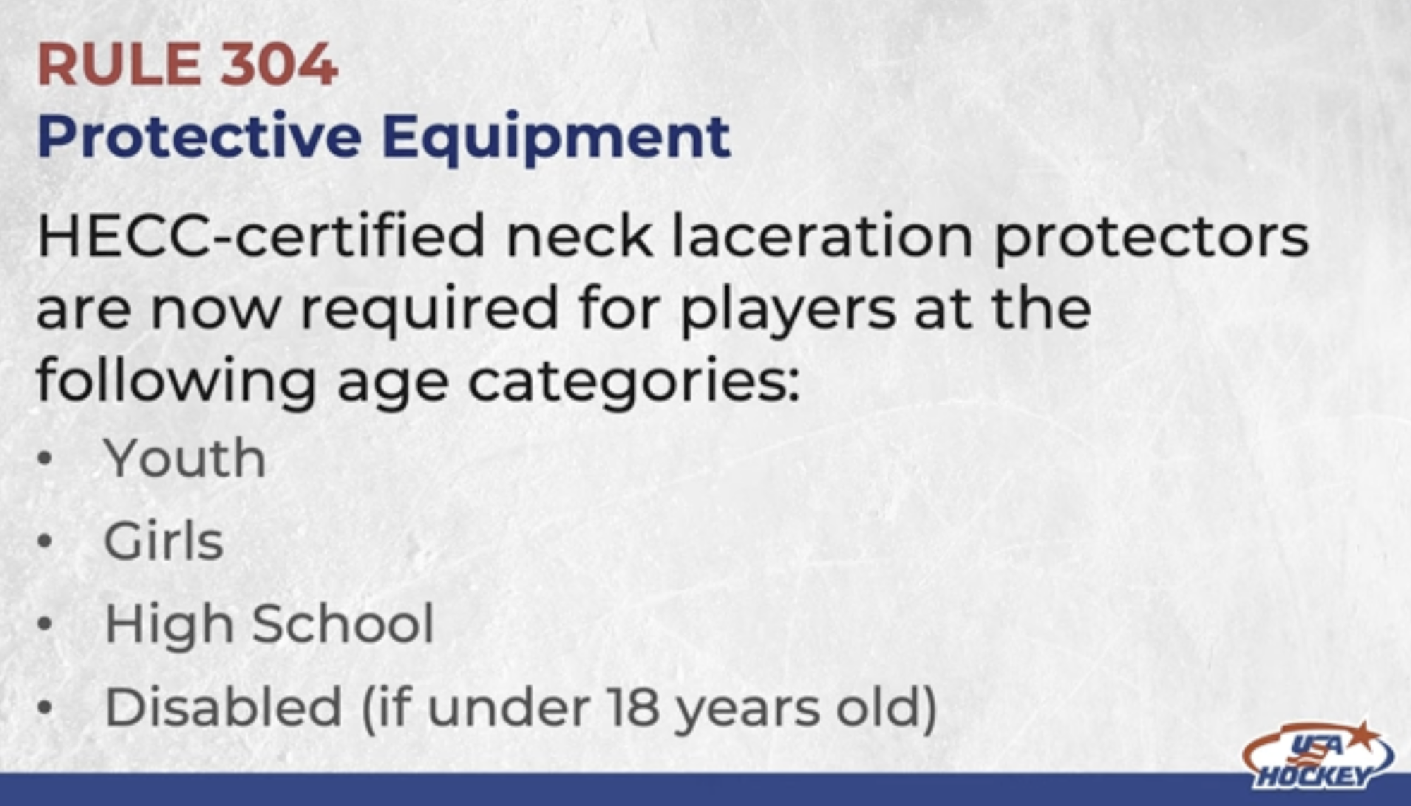 Requires HECC certified neck laceration protectors for all Youth, Girls and High School players. With note allowing BNQ certified NLP’s for 2025-26 and 2026-27 seasons.