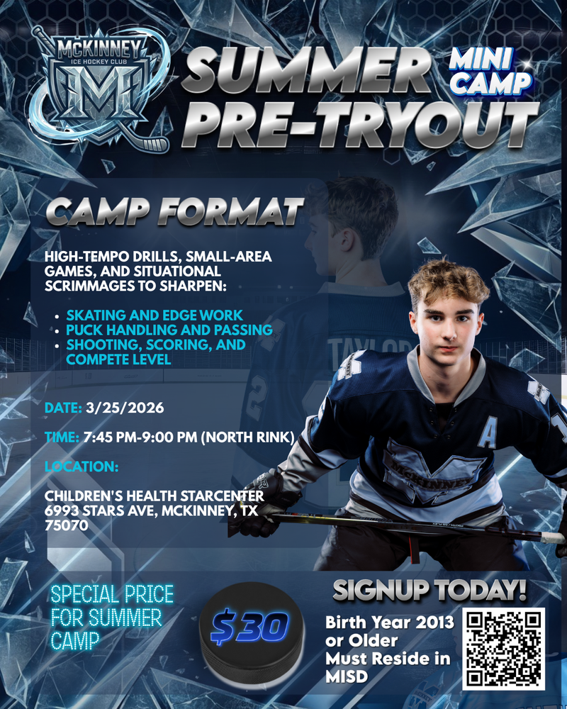 Get ready, McKinney the MIHC 2026 Pre‑Tryout Camp is here! This is your player’s chance to shake off the rust, get in front of the coaching staff, and head into formal tryouts with confidence.