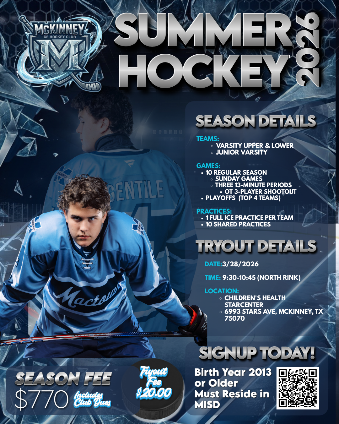 McKinney Ice Hockey Club invites all eligible high school players to our 2026 Summer High School Hockey Tryouts. This summer evaluation skate is designed for rising and current high school athletes who wish to compete for roster spots with McKinney Ice Hockey Club for the upcoming season.