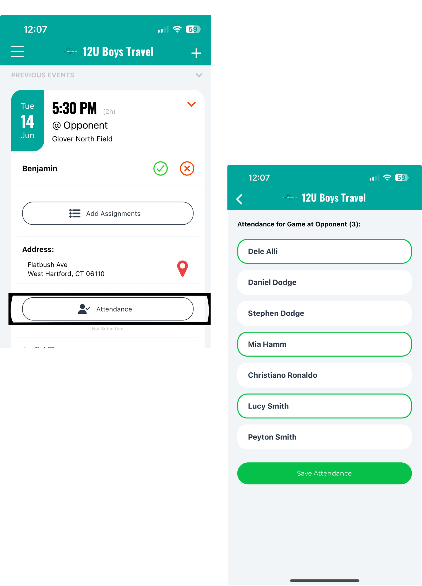 - Once enabled, after a game or practice is completed, you can report the attendance for that event:
