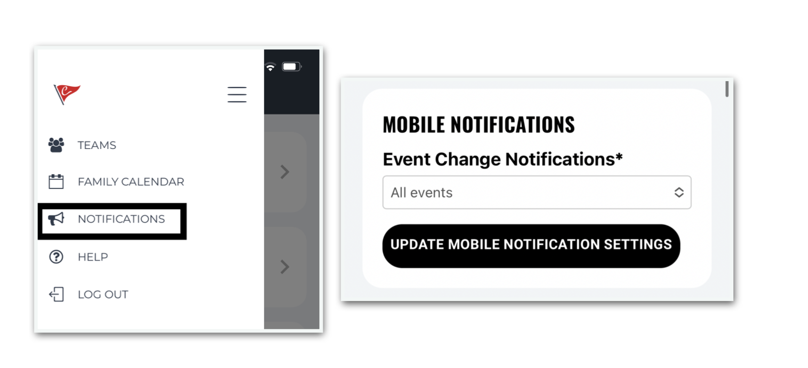 - From the app, select Notifications, and follow the redirect to the Site where you'll select "All Events" from the Mobile Notifications dropdown