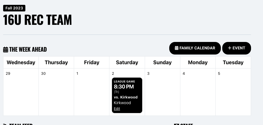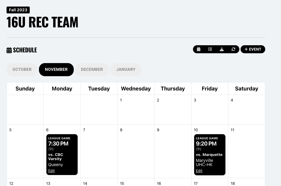 - Events can be added by Team Staff on your Team Page by selecting “+Event.” This will allow you to add Games, Meetings, Practices, or Other events.