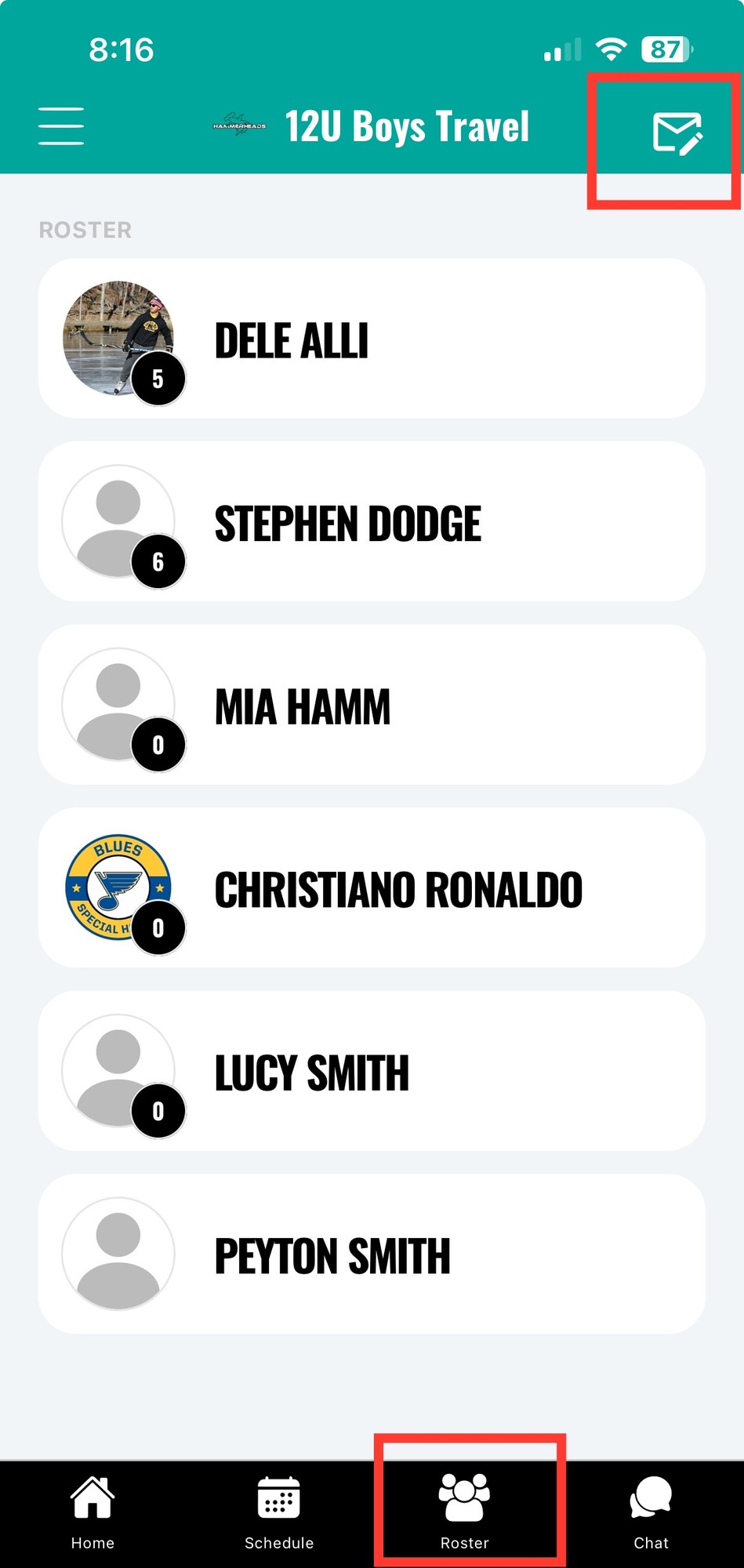 - Emailing from the Mobile App: On your Roster page for your Team in the Mobile App, you can choose to Email your Team. Here, you can choose to email individual families, your team staff, or everyone on the team. When sending this message, you can also choose to send the message in the Team Chat, ensuring folks on your team receive the note in both places.