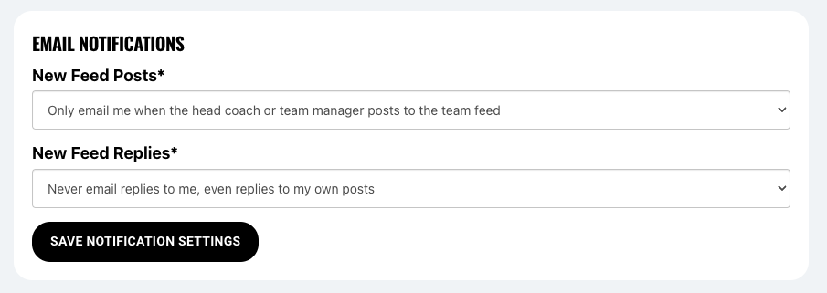 - Parents set their own Email Preferences under their Account on the Site and under "Settings" on the Team Page.